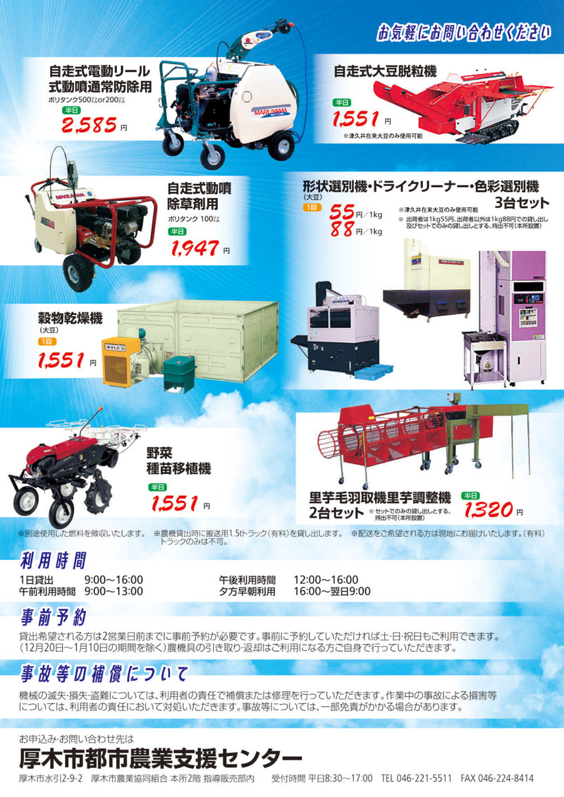 料金、動画などは JAあつぎ 農業機械レンタル事業 でもご覧いただけます。